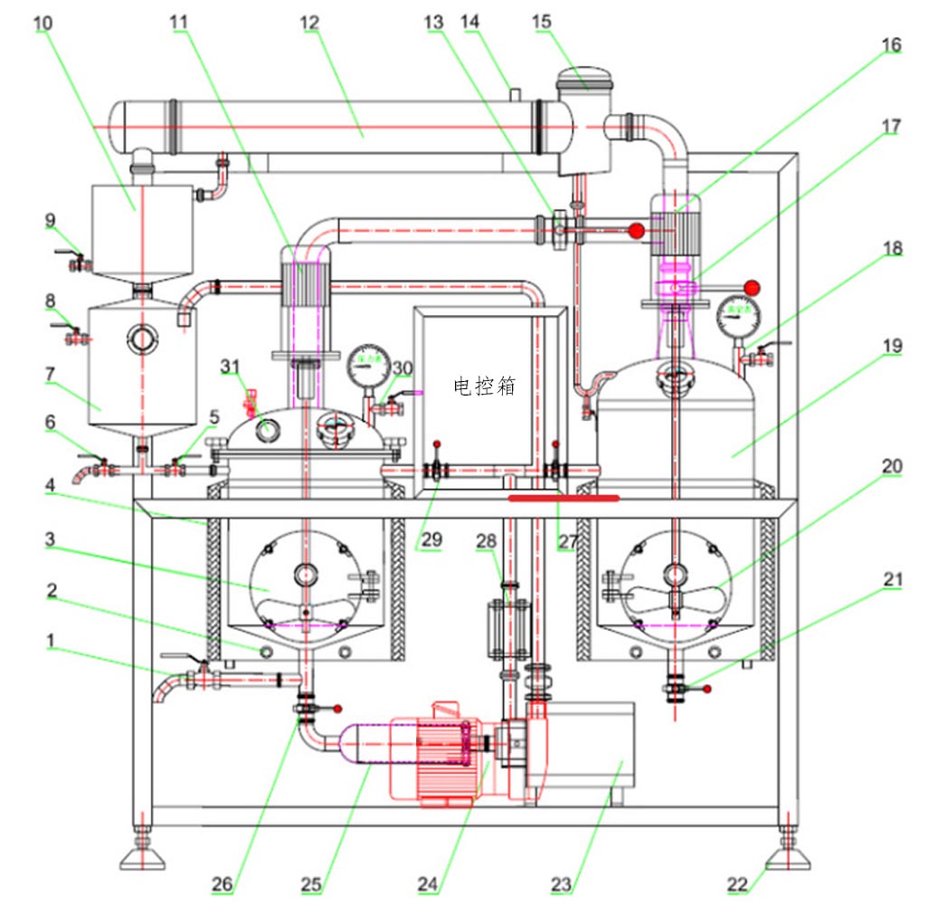 25.管道過(guò)濾器; 26.出料閥; 27.濃縮罐進(jìn)料閥; 28.管路視鏡; 29.熱回流閥; 30.放氣閥; 31.投料口