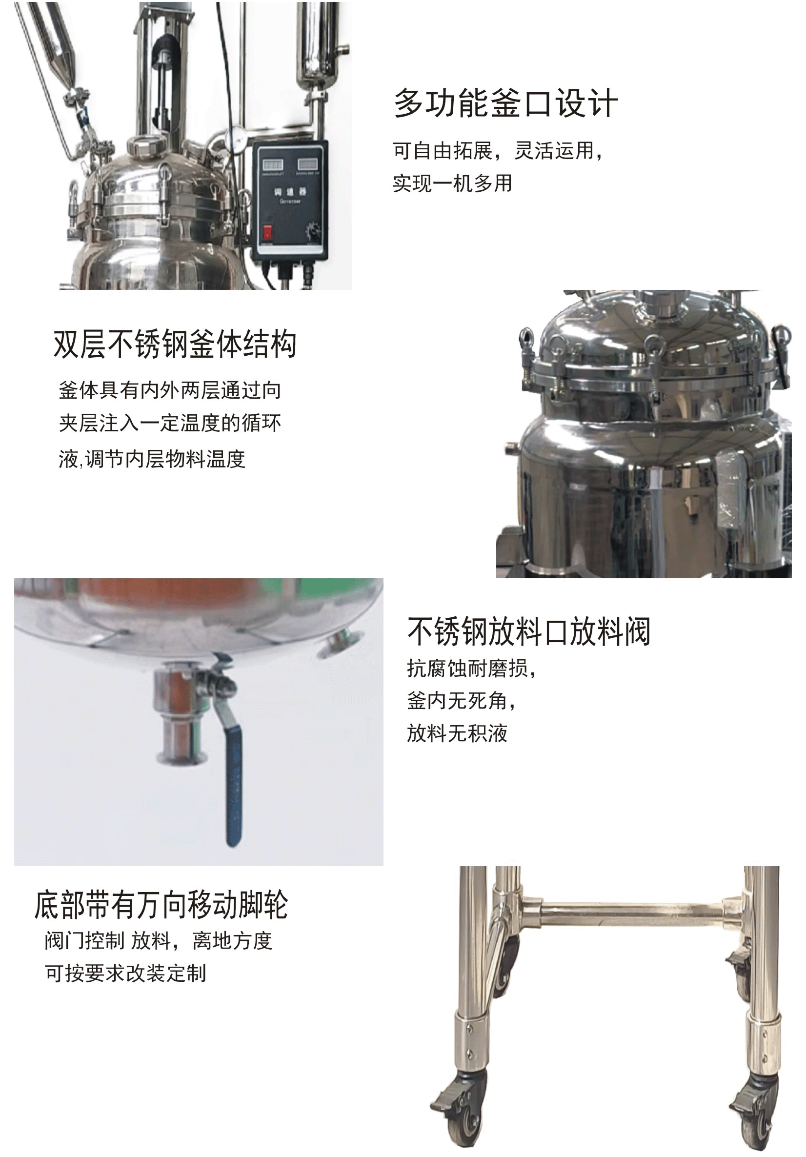 ●夾層的制冷或加熱溶液在反應(yīng)完畢后,能徹底排除,不積液